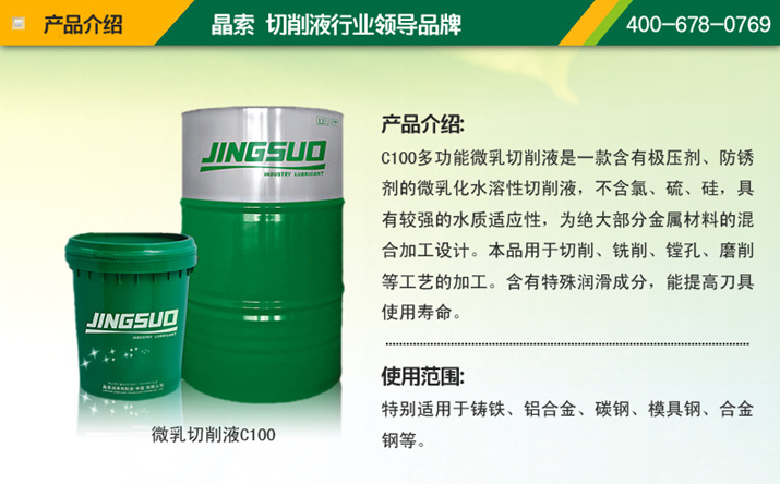 • 多功能微乳切削液C100是一款含有極壓劑、防銹劑的微乳化水溶性切削液,不含氯、硫、硅,具有較強的水質(zhì)適應性,為絕大部分金屬材料的混合加工設計。本品用于切削、銑削、鏜孔、磨削等