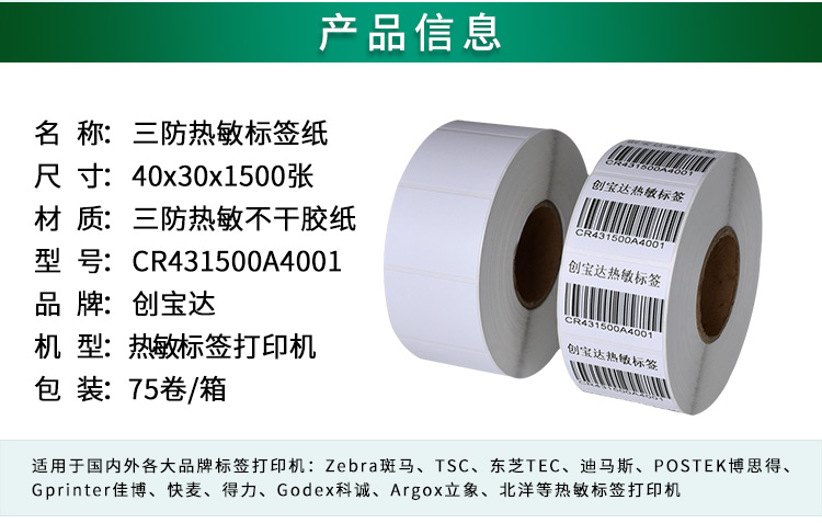 【規(guī)格】卷裝40mm*30mm*1500張/卷單排(足數(shù):1500張)一箱裝75卷