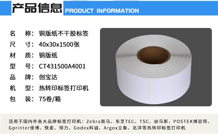 適合不同氣候地區使用,適用電子電器、五金塑膠、服裝、醫藥、日化、食品、商超、倉儲物流、資產管理、條碼標識、外箱貼紙等長期保存的產品標簽及外箱標簽同時也可以用于長時間保存(配合碳帶)的亞馬遜、郵政國際、物流標簽、郵政包裹、EBAY、速賣通、遞四方、出口EUB標簽、出口電商等標簽