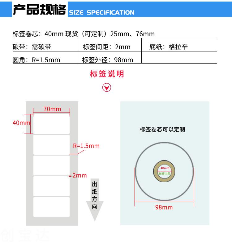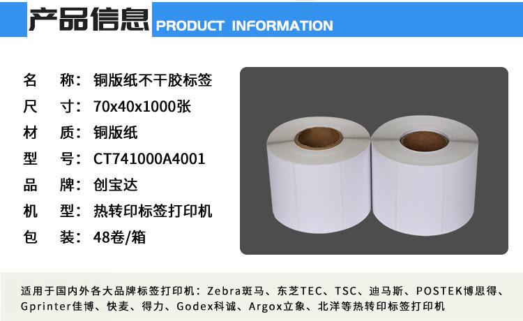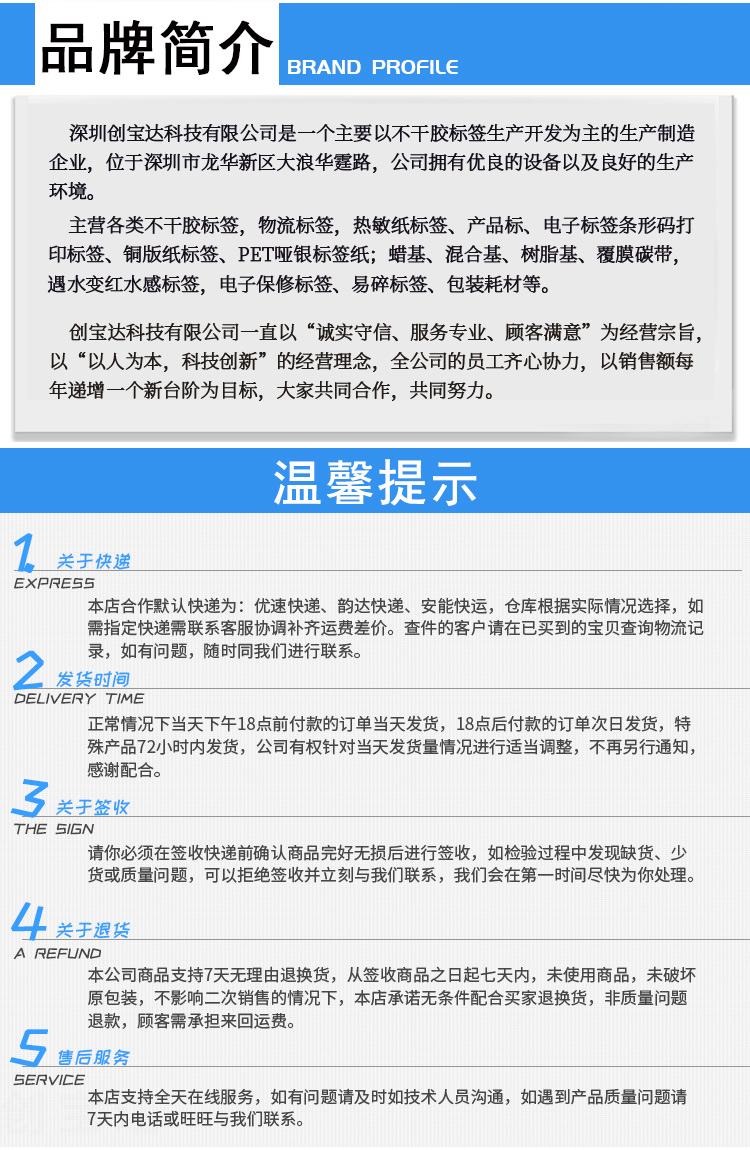 適合不同氣候地區使用,適用電子電器、五金塑膠、服裝、醫藥、日化、食品、商超、倉儲物流、資產管理、條碼標識、外箱貼紙等長期保存的產品標簽及外箱標簽同時也可以用于長時間保存(配合碳帶)的亞馬遜、郵政國際、物流標簽、郵政包裹、EBAY、速賣通、遞四方、出口EUB標簽、出口電商等標簽
