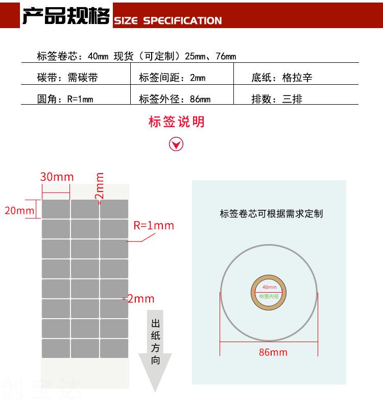 【規(guī)格】30mm*20mm*5000張/卷(足數(shù))40卷/箱