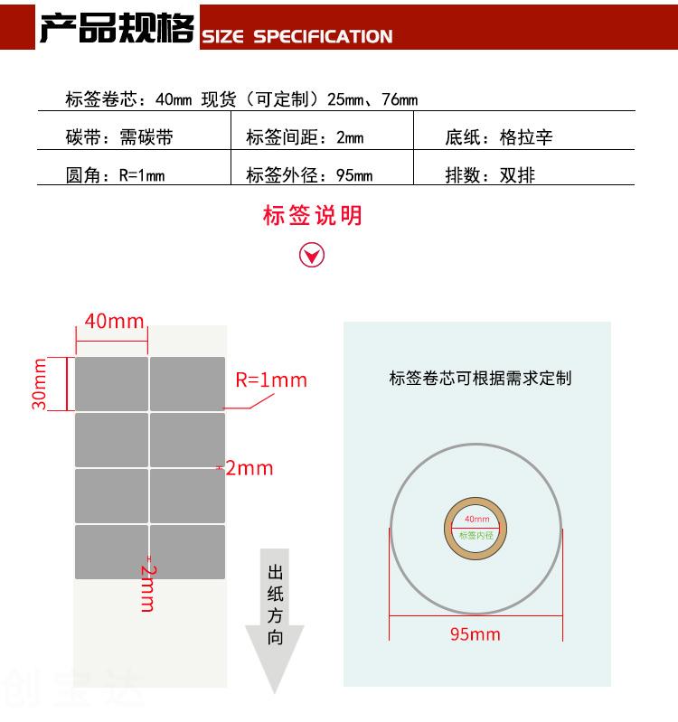 【標簽間距】2mm、圓角R=1.5MM、卷芯內徑:40mm