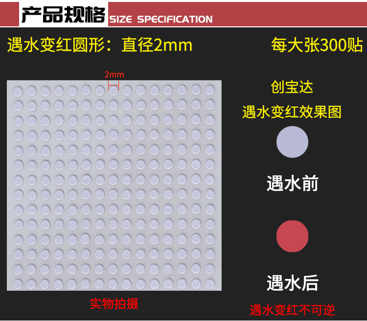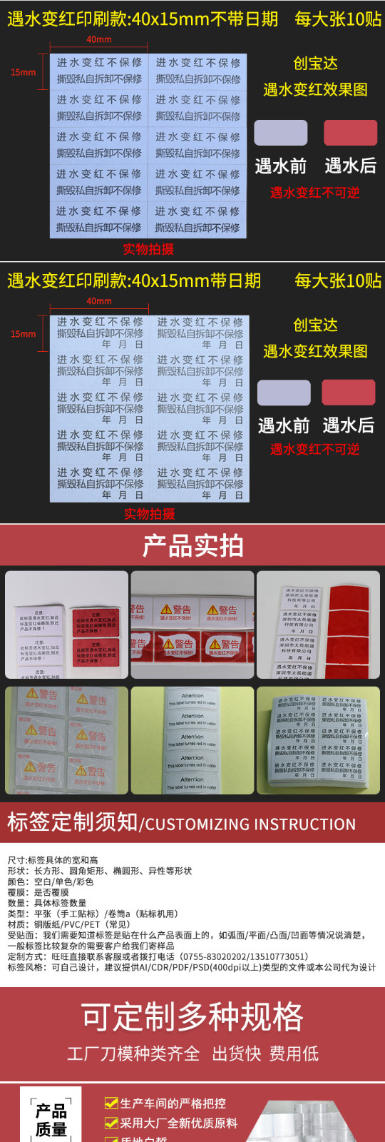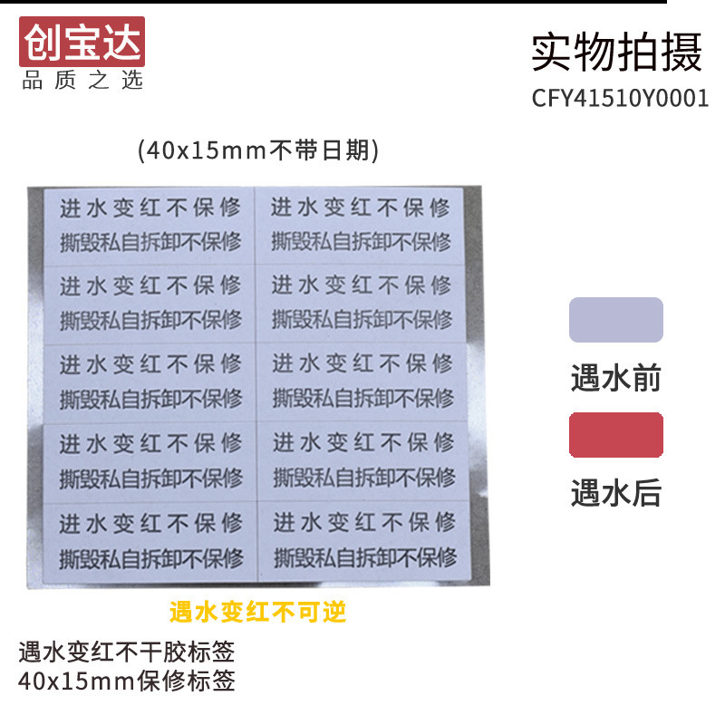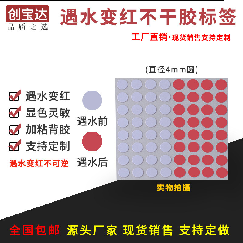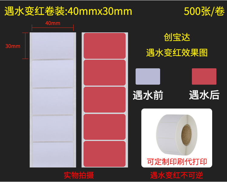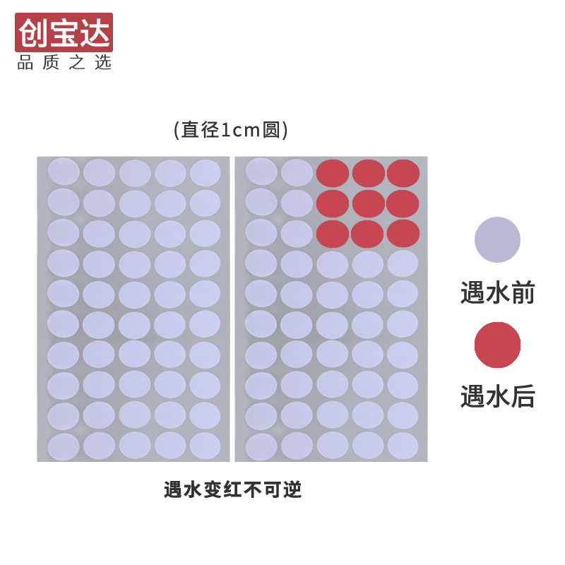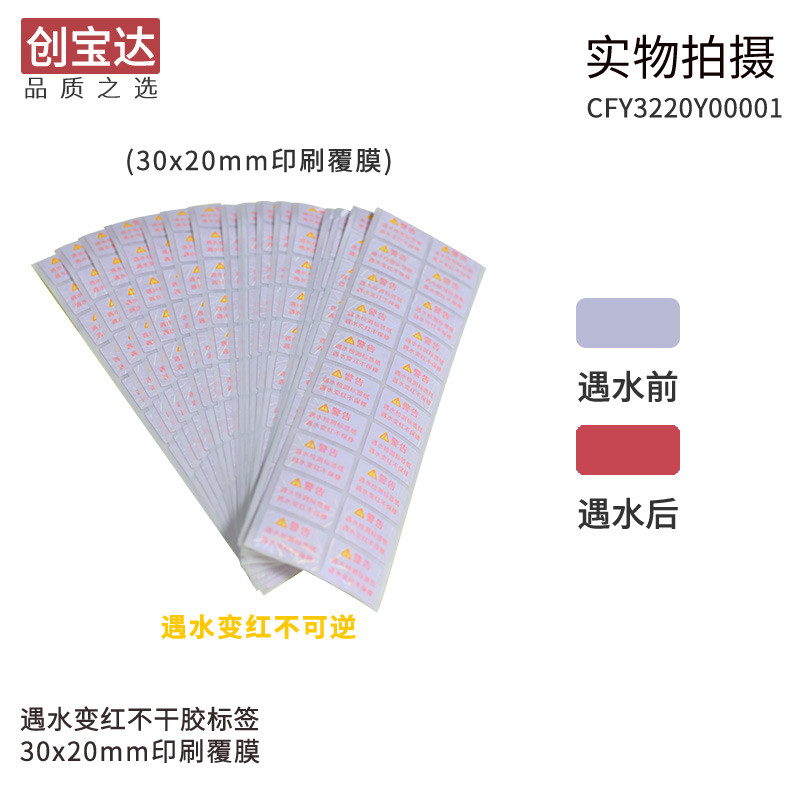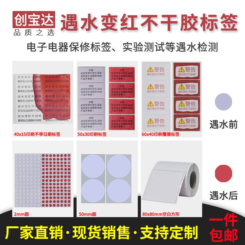 遇水變色標簽,也稱水感標簽。此標簽完全遇水時將會變紅色,顏色不可逆轉。是針對目前維修服務對手機、電池、電子、電器、LCD等產品遇水損壞后難以識別或錯誤識別、控制不符合條件的保修,同時也是為遠洋運輸貨物進水鑒別、為索賠提供合法依據而開發出來的一種新型產品。